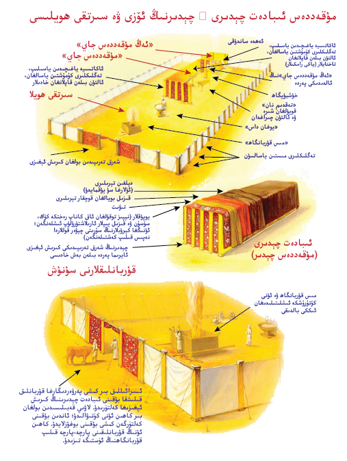 □ 30 بۇنىڭدىن ئۇ جامائەت چېدىرىنىڭ كىرىش ئېغىزىنىڭ تەگلىكلىرىنى، مىس قۇربانگاھنى، ئۇنىڭ مىس شالاسى ۋە قۇربانگاھنىڭ بارلىق ئەسۋابلىرىنى،
