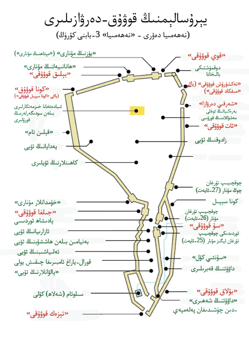 □ 13 شۇڭا مەن خەلقنى جەمەت-جەمەت بويىچە، قولىغا قىلىچ، نەيزە ۋە ئوقيالىرىنى ئېلىپ، سېپىلى پەس بولغان ياكى ھۇجۇمغا ئوچۇق تۇرغان يەرلەردە سېپىلنىڭ ئارقىسىدا قاراۋۇللۇقتا تۇرۇشقا قويدۇم.