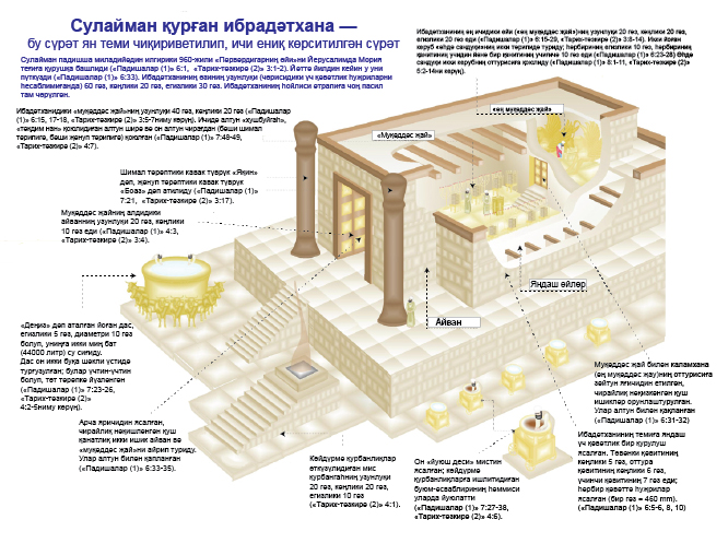□6:2 «ибадәтханиниң узунлуғи...» — ибраний тилида «өйниң узунлуғи...». «Пәрвәрдигарға ясиған ибадәтханиниң узунлуғи атмиш гәз...» — Муқәддәс Китапта ишлитилгән «гәз»ни бәлким бир «җәйнәк» дейишкә тоғра келиду — Йәни адәмниң җәйнигидин бармақлириниң учиғичә болған арилиқ (тәхминән 45 сантиметр) еди.