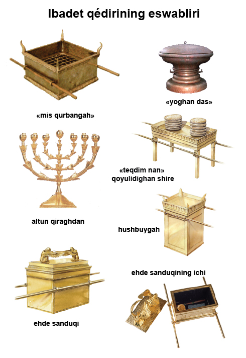 ■ 3 U qurban’gahning barliq eswablirini — uninggha xas bolghan daslarni, gürjeklerni, korilarni, laxshigirlarni we otdanlarnimu yasidi; uning barliq eswablirini mistin yasidi.