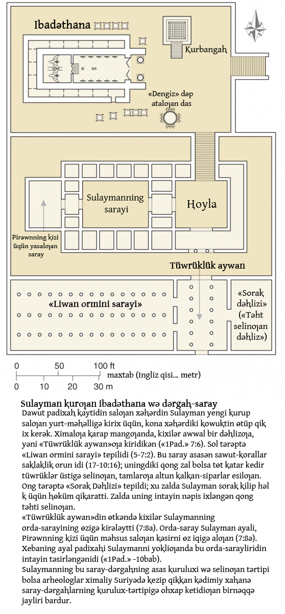 Sulayman ɵzi olturidiƣan saray, yǝni dǝⱨlizning arⱪa ⱨoylisiƣa jaylaxaⱪan sarayning layiⱨisi «soraⱪ ɵyi»ningkigǝ ohxax idi. Sulayman ɵz ǝmrigǝ alƣan Pirǝwnning ⱪizi üqün xu dǝⱨlizgǝ ohxax bir sarayni yasatti. «...yǝni dǝⱨlizning arⱪa ⱨoylisiƣa jaylaxaⱪan sarayning...» — baxⱪa birhil tǝrjimisi «...yǝni xu ɵydin ayrim bolƣan, bir ⱨoyliliⱪ, dǝⱨliz iqigǝ jaylaxⱪan ɵyning...».   1Pad. 3:1