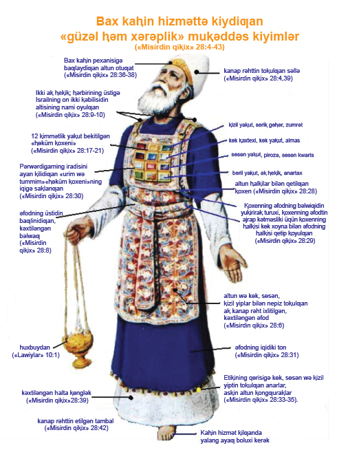 4 Ular tikidiƣan kiyimlǝr munulardin ibarǝt: — bir ⱪoxen, bir ǝfod, bir ton, kǝxtilǝngǝn bir halta kɵnglǝk, bir sǝllǝ wǝ bir bǝlwaƣ. Mening kaⱨinliⱪ hizmitimdǝ boluxi üqün, ular akang Ⱨarunƣa wǝ oƣulliriƣa muⱪǝddǝs kiyimlǝrni tiksun.