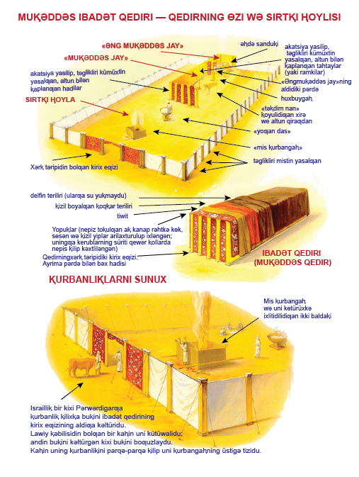 29 «Pulanglatma ⱨǝdiyǝ» süpitidǝ kǝltürülgǝn mis bolsa yǝtmix talant, ikki ming tɵt yüz xǝkǝl qiⱪti. «yǝtmix talant, ikki ming tɵt yüz xǝkǝl...» — bir «talant» mis 1500 xǝkǝl yaki bǝzidǝ 3000 xǝkǝl ⱨesablinidu; bir xǝkǝl mis 224 gram yaki 540 gram boluxi mumkin. Undaⱪta bu misning eƣirliⱪi 23-92 tonna otturisida bolsa kerǝk. 30 Buningdin u jamaǝt qedirining kirix eƣizining tǝgliklirini, mis ⱪurbangaⱨni, uning mis xalasi wǝ ⱪurbangaⱨning barliⱪ ǝswablirini, 31 ⱨoylining qɵrisidiki hada tǝgliklirini, ⱨoylining kirix eƣizidiki tǝgliklǝrni, qedirning barliⱪ ⱪozuⱪlirini wǝ ⱨoylining qɵrisidiki ⱪozuⱪlarning ⱨǝmmisini yasidi.