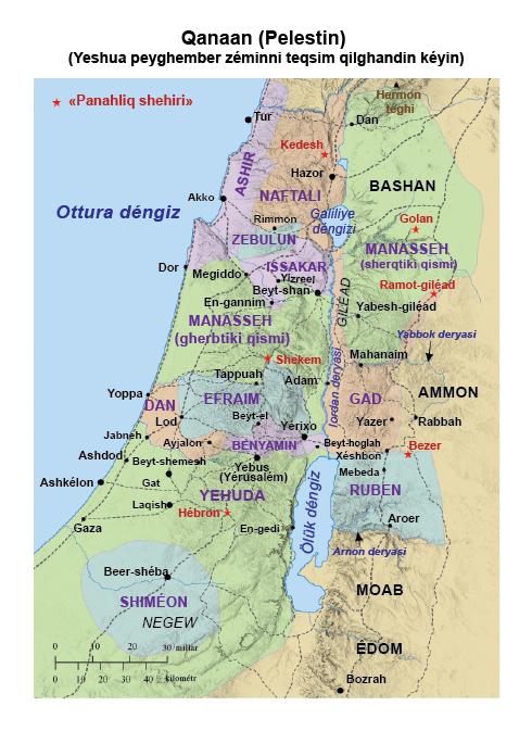 Emma Yeshua yashinip, yéshi xéli bir yerge bérip qalghanidi. Perwerdigar uninggha mundaq dédi: — «Sen emdi qérip qalding, yéshingmu chongiyip qaldi, lékin yene igilinishi kérek bolghan nurghun zémin bar. Bu zéminlar bolsa munular: — Filistiylerning we Geshuriylarning barliq yurtliri, 3-4 yeni Misirning sherq teripidiki Shihor deryasidin tartip, shimal teripidiki Ekron shehirining chégralirighiche sozulghan yerler (shu yurt Qanaaniylarning zémini hésablinatti), jümlidin Gaza, Ashdod, Ashkélon, Gat we Ekrondiki besh Filistiy emir bashquridighan yurtlar bilen Awwiylarning jenub tereptiki yurtliri; Zidoniylargha tewe bolghan Mearahdin tartip Afek bilen Amoriylarning chégrasighiche bolghan Qanaaniylarning barliq zémini; «Mearahdin» —yaki «Arahdin». Gebaliylarning zémini we barliq Liwan zémini, yeni kün chiqish tereptiki Hermon téghining étikidiki Baal-gadtin tartip, Xamat rayonigha kirish éghizighiche bolghan zéminlar; «Xamat rayonigha kirish éghizighiche...» — yaki «Libo-Xamatqiche...». Liwandin tartip Misrepot-Mayimghiche sozulghan taghliqta barliq olturuwatqanlarning, yeni Zidoniylarning zémini qatarliqlardin ibarettur. Bu zémindiki xelqning hemmisini Men Israil aldidin qoghliwétimen. Shunga sen choqum Méning sanga buyrughinim boyiche buni chek tashlap Israilliqlargha miras qilip teqsim qilip bérishing kérek. Sen emdi bu zéminlarni toqquz qebile bilen Manassehning yérim qebilisige miras qilip bölgin».